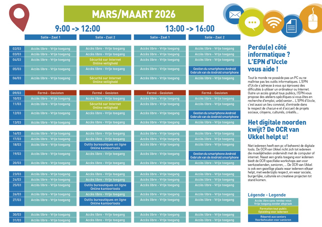 À une époque où le numérique s’impose dans tous les aspects de notre quotidien, chacun n’a pas toujours les moyens ou les connaissances nécessaires pour en profiter pleinement. C’est pourquoi l’EPN (espace public numérique) d'Uccle s’adresse à toute personne qui éprouve des difficultés à utiliser un ordinateur ou Internet, par manque de matériel ou par manque de compétences.